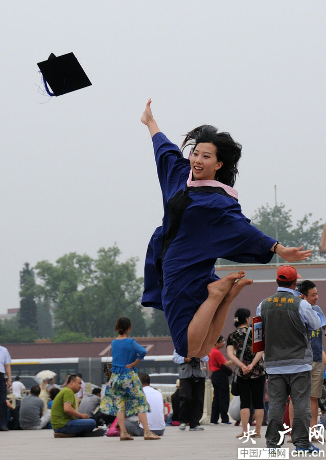 | College girls take creative graduation photos at the Tiananmen Square, Beijing, June 19, 2014. (Photo: cnr.cn) |