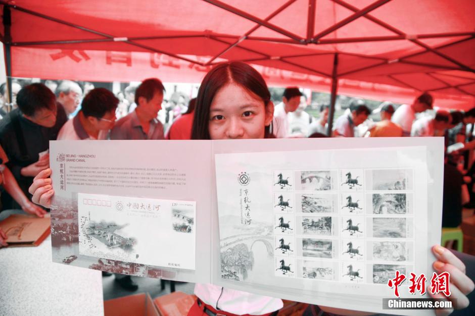 In celebration of the Grand Canal's inclusion on the World Heritage list, a ceremony for the issuance of a series of stamps and commemorative envelopes with ten scenes of the Grand Canal drawn by famous artists is held in Hangzhou, east China's Zhejiang Province, June 23, 2014. Each set is composed of three envelopes with the words "China's Grand Canal has been inscribed on the World Heritage List". At most 20,000 sets will be issued in Zhejiang Province. (Chinanews.com/Li Chenyun)
