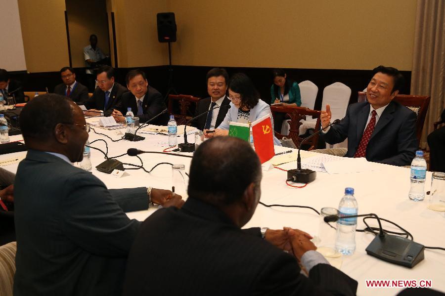 Visiting Chinese Vice President Li Yuanchao (1st R) meets with Philip Mangula (L, front), the Vice Chairman of the Revolutionary Party of Tanzania, in Dar es Salaam, Tanzania, June 24, 2014. (Xinhua/Zhang Ping)
