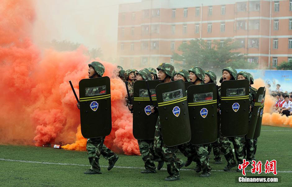 China's first college anti-terrorism and riot squad conducts a drill on the campus of Chengdu East Star Airlines Travel College on June 20. The police officers of the Chengdu Municipal Public Security Bureau will give the squad members two-month-long rigorous training which include physical training and tactical drills. (Chinanews.com/Zhong Xin)