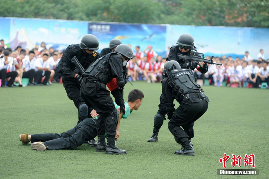 China's first college anti-terrorism and riot squad conducts a drill on the campus of Chengdu East Star Airlines Travel College on June 20. The police officers of the Chengdu Municipal Public Security Bureau will give the squad members two-month-long rigorous training which include physical training and tactical drills. (Chinanews.com/Zhong Xin)