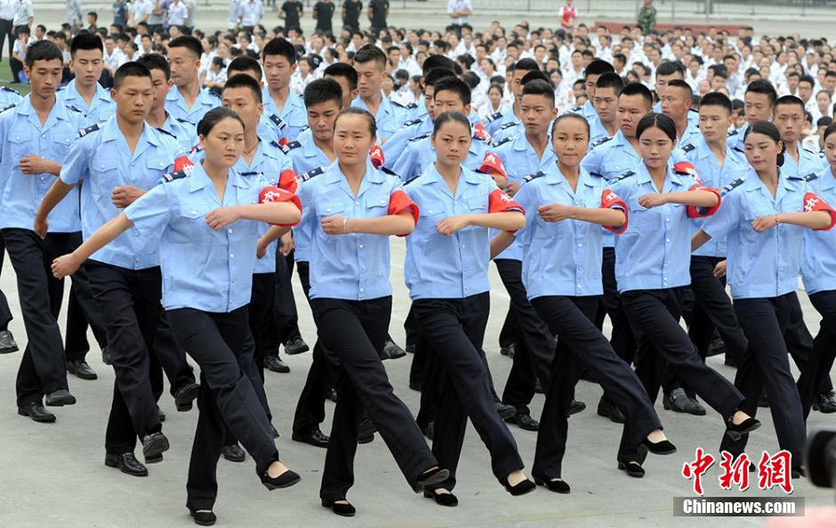 China's first college anti-terrorism and riot squad conducts a drill on the campus of Chengdu East Star Airlines Travel College on June 20. The police officers of the Chengdu Municipal Public Security Bureau will give the squad members two-month-long rigorous training which include physical training and tactical drills. (Chinanews.com/Zhong Xin)