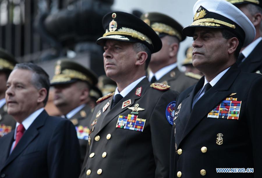 The General Commander of the National Army of Venezuela, Alexis Ascension Lopez Ramirez (C) presides the national flag raising ceremony during commemoration of 193 anniversary of Carabobo Battle and the Army Day, in Caracas, Venezuela, on June 24, 2014. (Xinhua/Ricardo Herdenez/AVN)