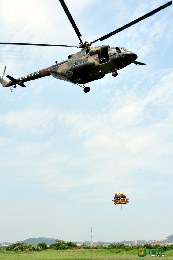 | A flight formation of attack helicopters which are loaded with air-to air missiles cruise during the flight training in Nanjing on June 19, 2014. (Photo/ Xiao Qingming) |
