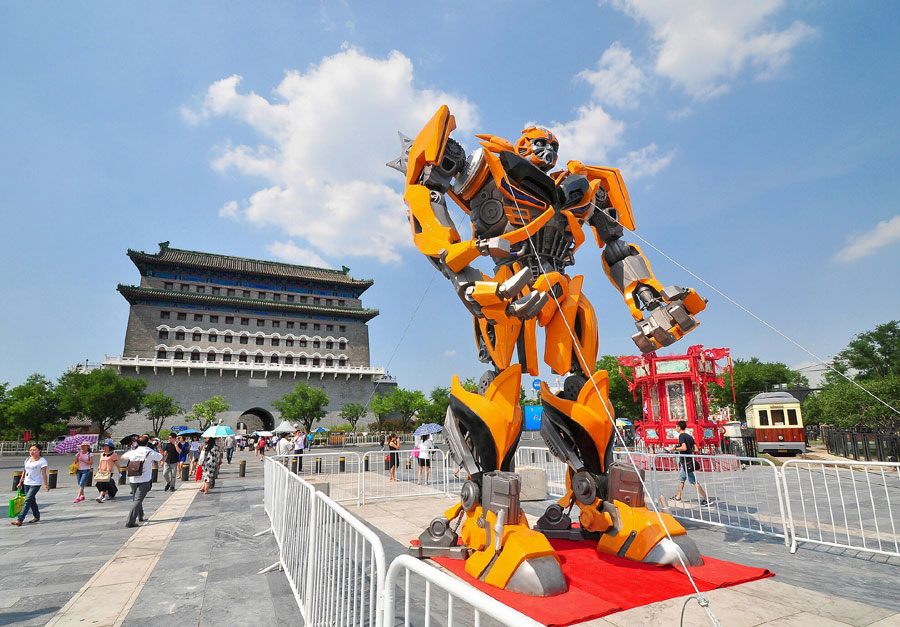 The Auto-Bots stand stalwart against the forces of evil on June 24, 2014, at a popular tourist spot on Qianmen Street in Beijing to herald the coming Chinese release of "Transformers: Age of Extinction" this coming Friday, June 27. The Auto-Bots attracted a wave of attention and pictures from Transformer fans and visiting tourists. [Photo: CRIENGLISH.com/ Song Xiaofeng]