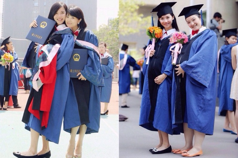 | A woman master holder‘s graduation photos go viral on Weibo, a twitter-like social media in China. According to her Weibo, she gave birth to a boy in her second year of postgraduate study and conceived a girl while busy with her dissertation for the master degree. Netizens praised her for good arrangement of life. (Photo source: Guangzhou Daily) |