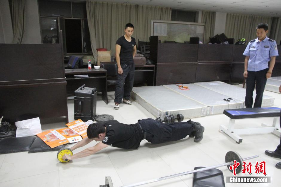 A policeman does exercise in their temporary dormitory. (CNS/ Xiao Xin)