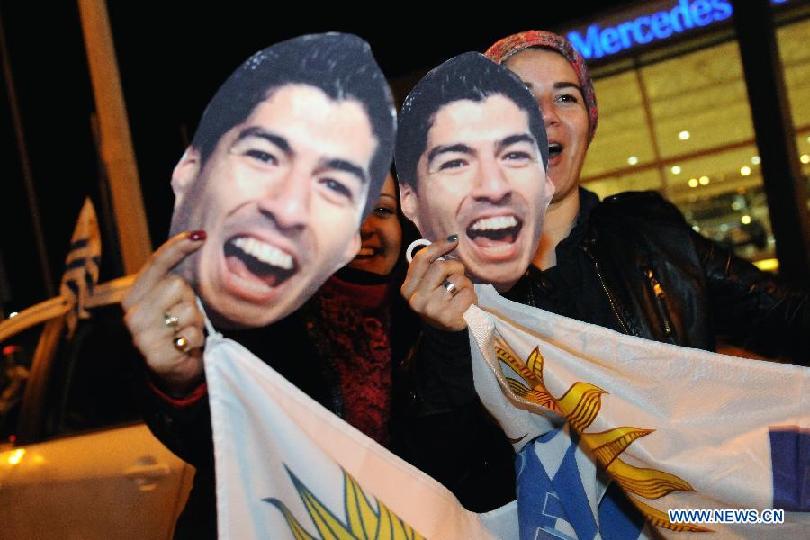 Fans wait for the arrival of the Uruguay's National Team player, Luis Suarez in the Carrasco National Airport in Montevideo, capital of Uruguay on June 26, 2014. The Uruguay forward was banned by FIFA from all football for four months on Thursday for biting an Italian opponent in the first round match of 2014 FIFA World Cup. Uruguay will face Colombia on June 28, in FIFA World Cup Brazil 2014. (Xinhua/Nicolas Celaya)