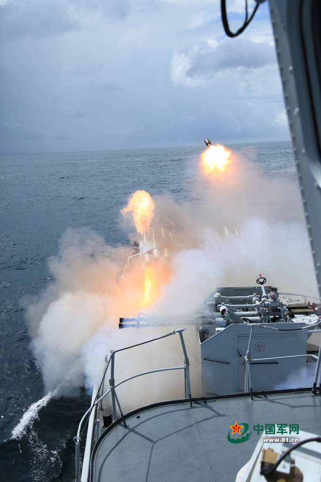 A fleet of frigates conducts combat drills in East China Sea on June 25, 2014. Soldiers fired rocket depth-charge missiles during the drills. (Photo/ Zhou Daoxian)