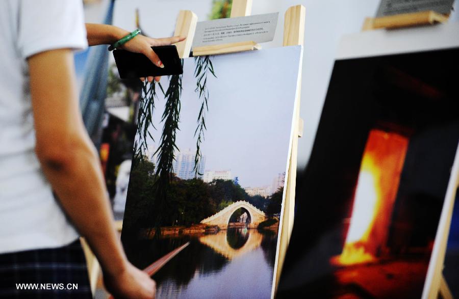 | Photo taken by Russian Prime Minister Dmitry Medvedev are shown on display at the China-Russia Expo (CR Expo) in Harbin, capital of northeast China's Heilongjiang Province, June 30, 2014. The expo, which kicked off on June 30, will last until July 4. (Xinhua/Wang Jianwei) |