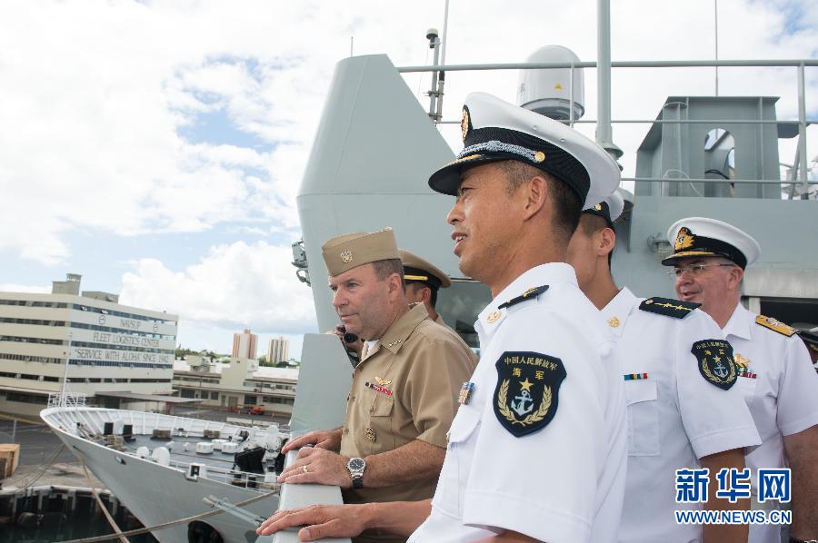 U.S. Vice Adm. Kenneth Floyd (1st left), commander of the U.S. Third Fleet, visits PLA Navy supply ship Qiandaohu in Hawaii on June 28, 2014. (Photo/Xinhua)