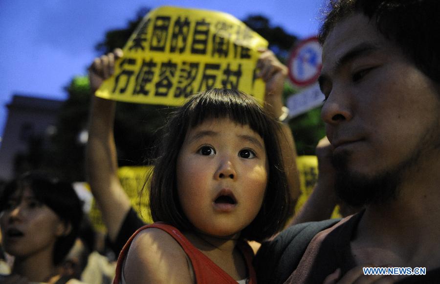 People attend a rally to protest against the attempt to exercise the rights to collective self-defense in front of the Prime Minister's official residence in Tokyo, Japan, June 30, 2014. Thousands of Japanese people gathered here Monday, protesting against Japanese Prime Minister Shinzo Abe's attempt to allow Japan's Self-Defense Forces (SDF) to exercise the rights to collective self-defense. The Japanese government sought to get a green light from the Cabinet on July 1 for a resolution that will allow Japan to exercise collective self-defense rights through reinterpreting the country's pacifist Constitution. (Xinhua/Liu Tian)