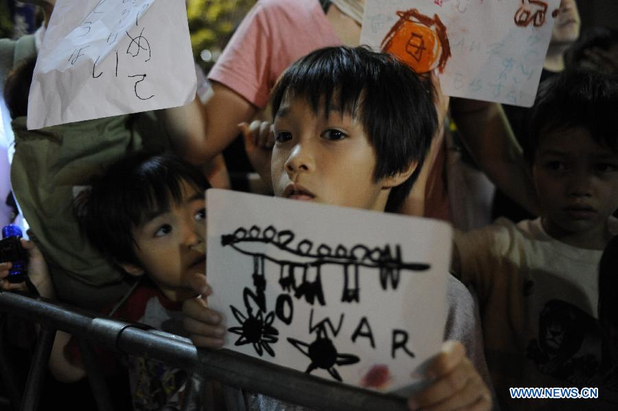 People attend a rally to protest against the attempt to exercise the rights to collective self-defense in front of the Prime Minister's official residence in Tokyo, Japan, June 30, 2014. Thousands of Japanese people gathered here Monday, protesting against Japanese Prime Minister Shinzo Abe's attempt to allow Japan's Self-Defense Forces (SDF) to exercise the rights to collective self-defense. The Japanese government sought to get a green light from the Cabinet on July 1 for a resolution that will allow Japan to exercise collective self-defense rights through reinterpreting the country's pacifist Constitution. (Xinhua/Liu Tian)