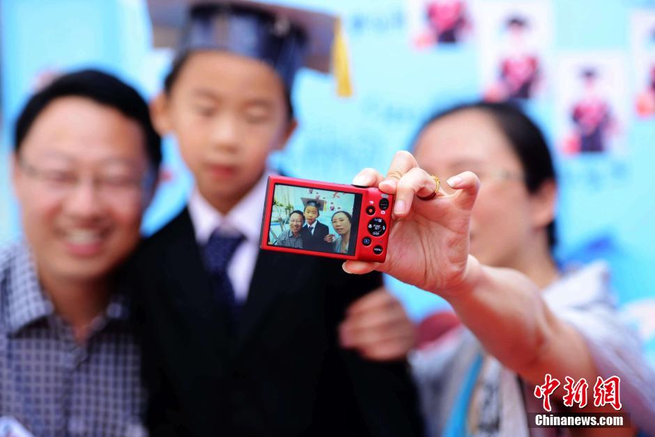 Children accompanied by their parents walk the red carpet at the graduation ceremony of a kindergarten in Qingdao in east China's Shandong province on June 28, 2014. The children signed their names on the board, like the shining stars. (Photo/CNS)