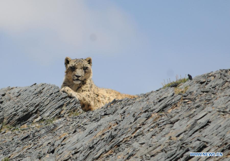 A wild snow leopard is seen in Chang Tang Nature Reserve, southwest China's Tibet Autonomous Region, June 30, 2014. A wild animal research team organized by local forestry bureau here were lucky to catch a chance to snap shot of a wild snow leopard. (Xinhua/Zongga)