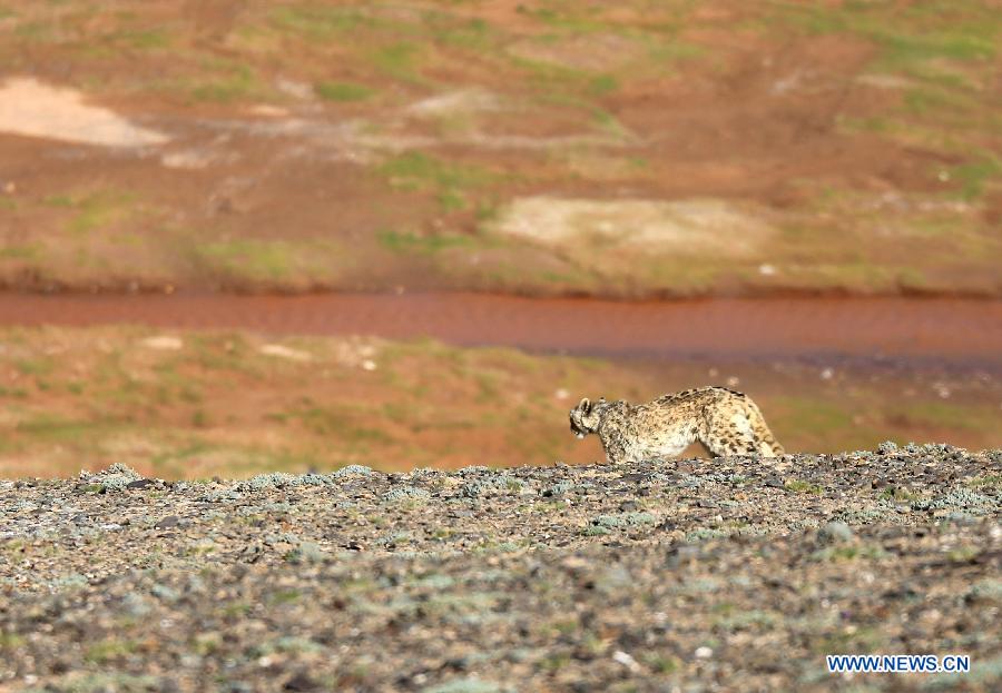 | A wild snow leopard looks for food in Chang Tang Nature Reserve, southwest China's Tibet Autonomous Region, June 30, 2014. A wild animal research team organized by local forestry bureau here were lucky to catch a chance to snap shot of a wild snow leopard. (Xinhua/Fan Shihui) |