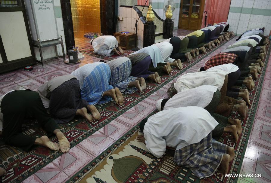 Muslims pray at a mosque during the holy month of Ramadan in Yangon, Myanmar, July 1, 2014. Muslims around the world celebrate Ramadan, the holiest month in the Islamic calendar, in which they abstain from eating, drinking and conducting sexual relations from sunrise to sunset. (Xinhua/U Aung)