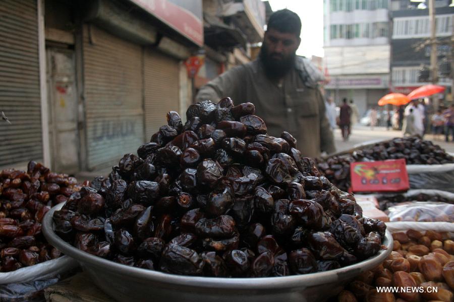 A vendor arranges dates on road as he waits for customers before Iftar (the dinner when Muslims break the daily fasting during Ramadan at sunset) during holy month of Ramadan in northwest Pakistan's Peshawar on July 1, 2014. Muslims around the world refrain from eating, drinking and smoking from dawn to dusk during the fasting month of Ramadan. (Xinhua/Ahmad Sidique)