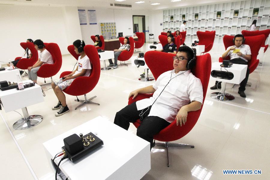 Residents listen to music on rotatable sofa chairs in a music library in Ouhai District of Wenzhou City, east China's Zhejiang Province, July 1, 2014. The music library here, covering more than 200 square meters, collected 592 original music CDs. A total of 15 rotatable sofa chairs are installed in the library for people to enjoy music. (Xinhua/Su Qiaojiang)