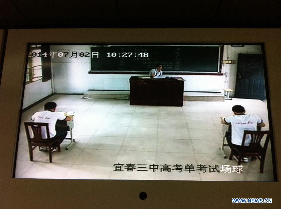 Real-time monitoring screen shows an exclusive college entrance exam taken by Liu Yanbing and Yi Zhengyong in Yichun, east China's Jiangxi Province, July 2, 2014. Liu Yanbing and Yi Zhengyong, both from No.3 Middle School in Yichun, were seriously injured during a fight against an assailant who was stabbing passengers on a bus on May 31. They were unable to take the national college entrance exam, on June 7 and 8 as they were still recovering from their injuries. It is the first time Jiangxi's educational authority has organized a separate test for candidates. The two students underwent security checks and went through a metal detector before taking the exam. Digital cameras were installed in the classroom to record the test. More than 10 universities including the prestigious Tsinghua University said earlier that they would like to enroll the students with preferential policies. (Xinhua/Wen Meiliang)