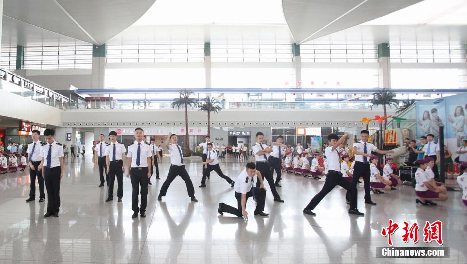 More than one hundred staff members of the Chengdu East Railway Station stage a flash mob dance to celebrate the operation of high-speed trains from Chengdu to Shanghai, Nanjing, and Wuhan in Chengdu, capital of southwest China's Sichuan province on July 1, 2014. (Chinanews.com/Zhu Linlin)