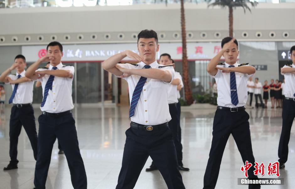 More than one hundred staff members of the Chengdu East Railway Station stage a flash mob dance to celebrate the operation of high-speed trains from Chengdu to Shanghai, Nanjing, and Wuhan in Chengdu, capital of southwest China's Sichuan province on July 1, 2014. (Chinanews.com/Zhu Linlin)