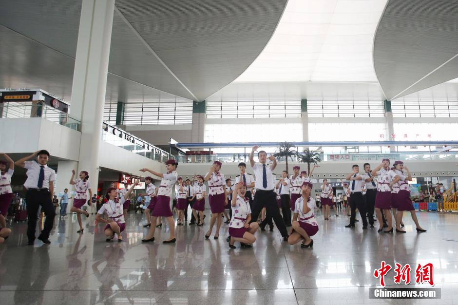 More than one hundred staff members of the Chengdu East Railway Station stage a flash mob dance to celebrate the operation of high-speed trains from Chengdu to Shanghai, Nanjing, and Wuhan in Chengdu, capital of southwest China's Sichuan province on July 1, 2014. (Chinanews.com/Zhu Linlin)