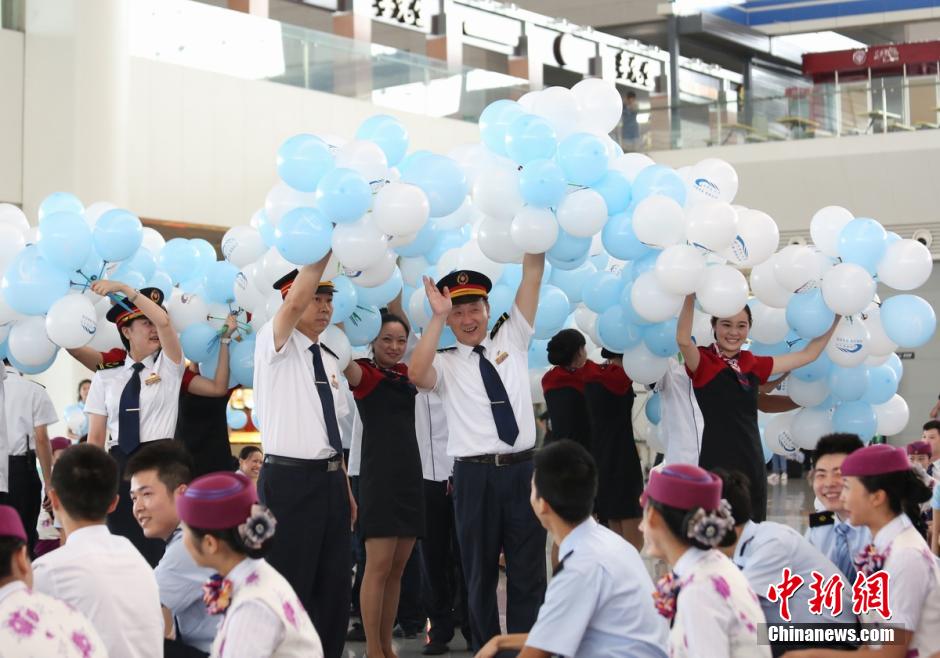| More than one hundred staff members of the Chengdu East Railway Station stage a flash mob dance to celebrate the operation of high-speed trains from Chengdu to Shanghai, Nanjing, and Wuhan in Chengdu, capital of southwest China's Sichuan province on July 1, 2014. (Chinanews.com/Zhu Linlin) |