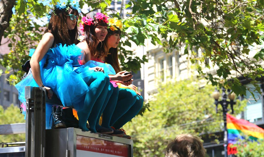 An estimate of 100,000 spectators and visitors flock to San Francisco on Sunday for the 44th annual Gay Pride Parade. Thousands of people from different groups participated in the parade with signs, banners or rode on floats. (People’s Daily Online/Han Shasha)