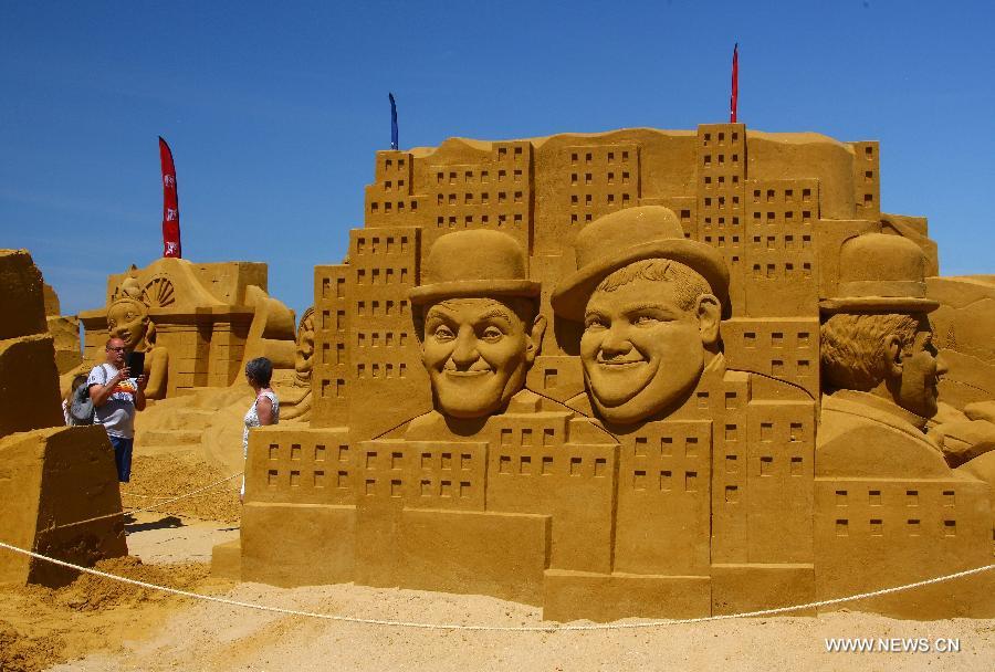 Tourists view sand sculptures during the Sand Sculpture Festival in Oostende, Belgium, July 2, 2014. About 150 sculptures created by more than 30 professional sand artists from about 10 countries were shown in the sand sculpture festival which would be held till the end of August. (Xinhua/Gong Bing)