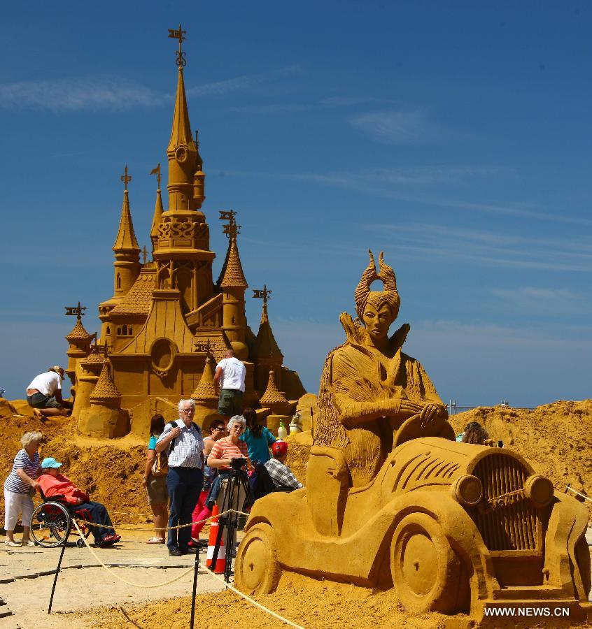 Tourists view sand sculptures during the Sand Sculpture Festival in Oostende, Belgium, July 2, 2014. About 150 sculptures created by more than 30 professional sand artists from about 10 countries were shown in the sand sculpture festival which would be held till the end of August. (Xinhua/Gong Bing)