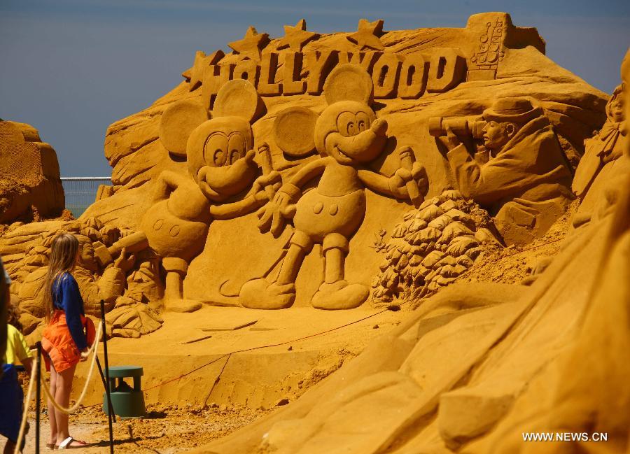Tourists view sand sculptures during the Sand Sculpture Festival in Oostende, Belgium, July 2, 2014. About 150 sculptures created by more than 30 professional sand artists from about 10 countries were shown in the sand sculpture festival which would be held till the end of August. (Xinhua/Gong Bing)
