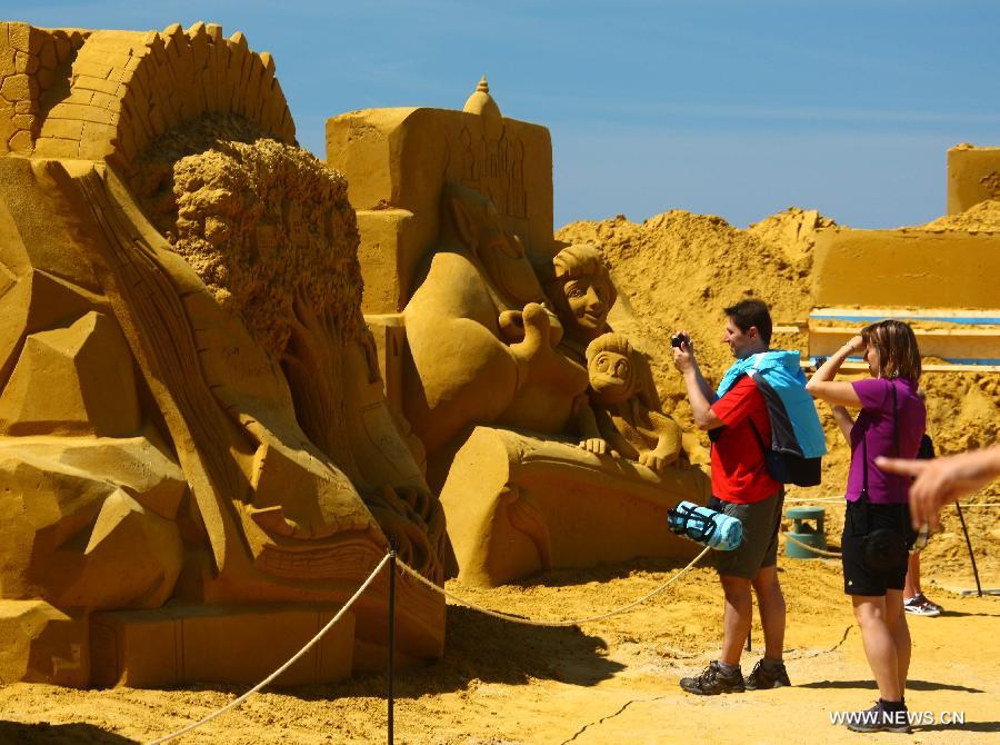 Tourists view sand sculptures during the Sand Sculpture Festival in Oostende, Belgium, July 2, 2014. About 150 sculptures created by more than 30 professional sand artists from about 10 countries were shown in the sand sculpture festival which would be held till the end of August. (Xinhua/Gong Bing)