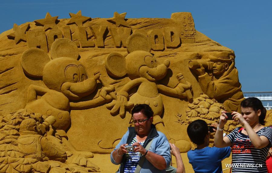Tourists view sand sculptures during the Sand Sculpture Festival in Oostende, Belgium, July 2, 2014. About 150 sculptures created by more than 30 professional sand artists from about 10 countries were shown in the sand sculpture festival which would be held till the end of August. (Xinhua/Gong Bing)