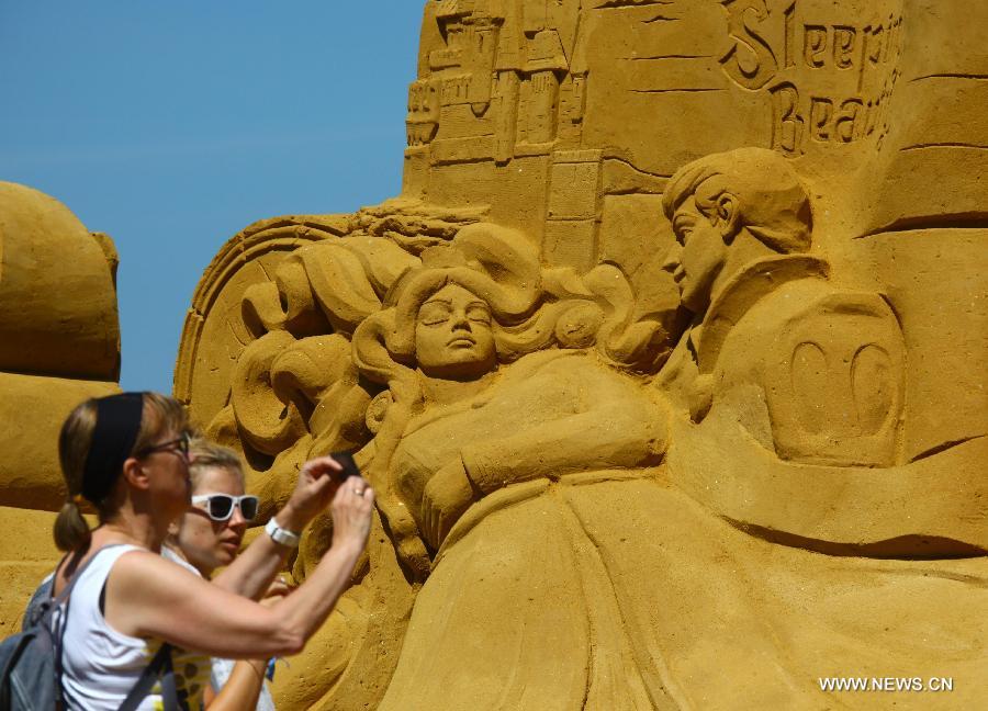 Tourists view sand sculptures during the Sand Sculpture Festival in Oostende, Belgium, July 2, 2014. About 150 sculptures created by more than 30 professional sand artists from about 10 countries were shown in the sand sculpture festival which would be held till the end of August. (Xinhua/Gong Bing)