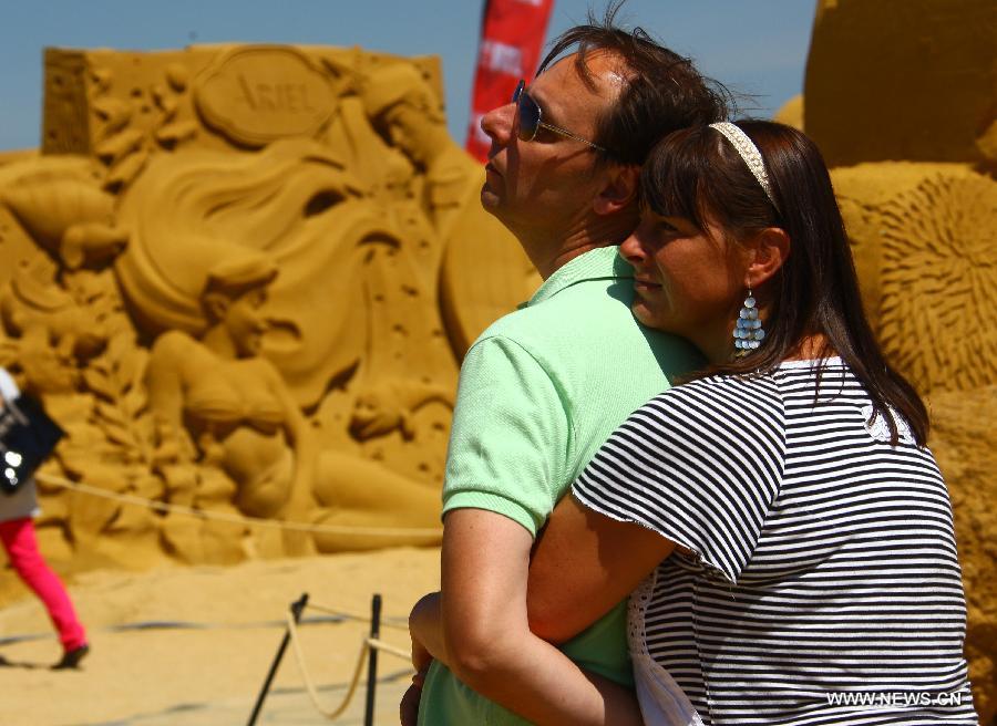 Tourists view sand sculptures during the Sand Sculpture Festival in Oostende, Belgium, July 2, 2014. About 150 sculptures created by more than 30 professional sand artists from about 10 countries were shown in the sand sculpture festival which would be held till the end of August. (Xinhua/Gong Bing)