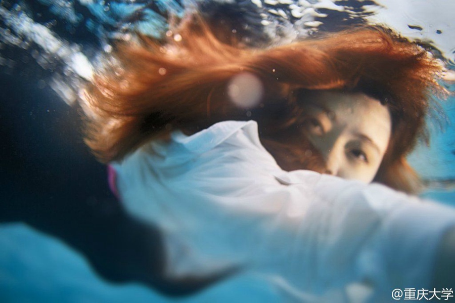 It's graduation season again, students around the country mark their special moments in various ways. Chongqing University's Weibo account posted a group of graduation photos last Tuesday, showing three college girls in bachelor's gowns under water. The photos became a hit on the Internet, being regarded as the most beautiful photos taken by netizens this summer. (Photo/Chongqing University)