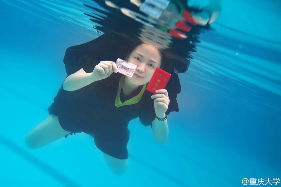It's graduation season again, students around the country mark their special moments in various ways. Chongqing University's Weibo account posted a group of graduation photos last Tuesday, showing three college girls in bachelor's gowns under water. The photos became a hit on the Internet, being regarded as the most beautiful photos taken by netizens this summer. (Photo/Chongqing University)