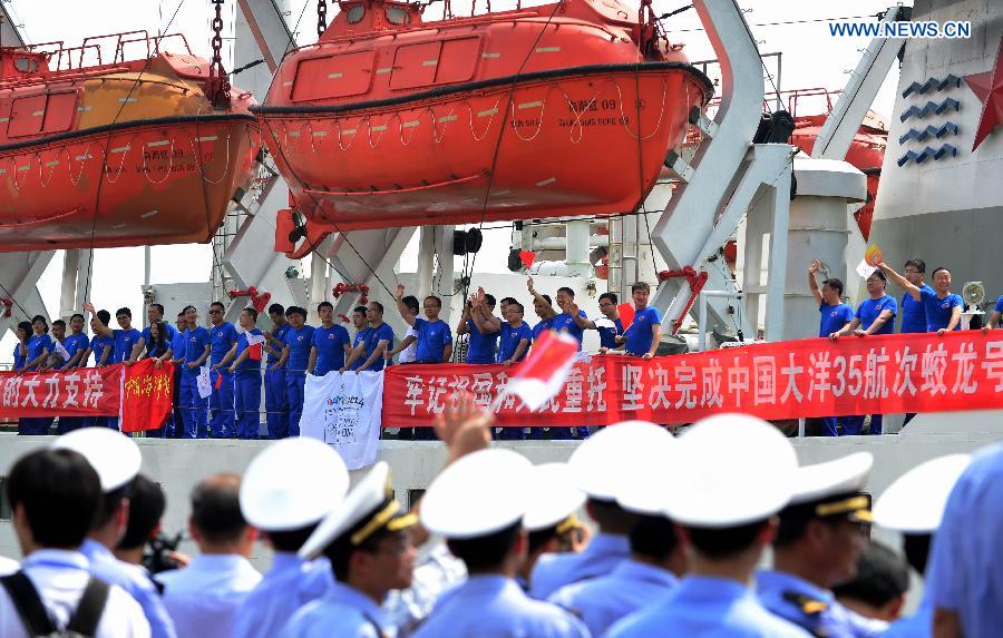Xiangyanghong 09, carrier of Jiaolong, China's first manned deep-sea submersible, sets sail from Fuzhou, capital of southeast China's Fujian Province, for the submersible's first expedition mission in the 2014-2015 period, July 4, 2014. Jiaolong on Friday embarked on a scientific expedition in the Pacific Ocean. It is scheduled for a voyage in the northwest Pacific Ocean, during which it will research cobalt-rich crusts and life forms inhabiting the bottom of the sea. (Xinhua/Wei Peiquan)