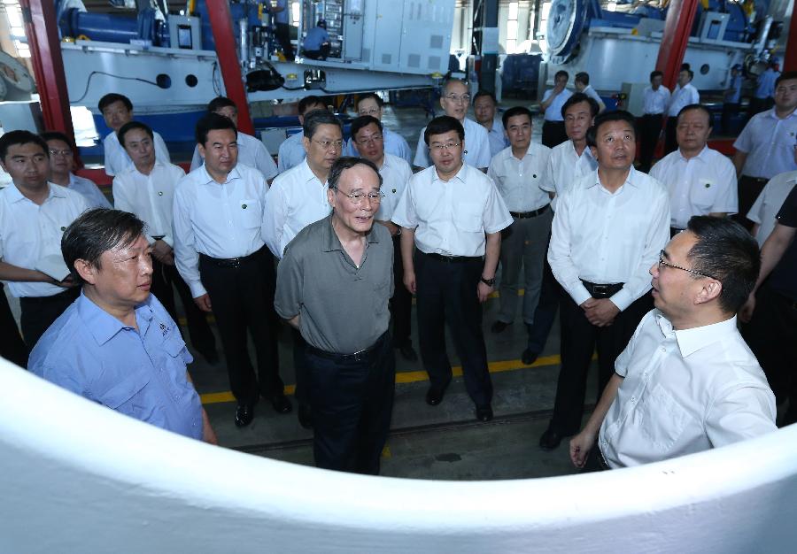 Wang Qishan (C front), a member of the Standing Committee of the Political Bureau of the Communist Party of China (CPC) Central Committee and secretary of the Central Commission for Discipline Inspection (CCDI) of the CPC, visits a wind power equipment company in Xilingol League, north China's Inner Mongolia Autonomous Region, July 3, 2014. Wang made an inspection tour in Xilingol League from July 3 to 4. (Xinhua/Pang Xinglei)