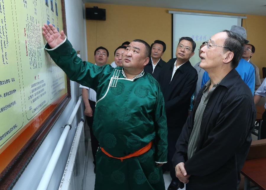 Wang Qishan (R), a member of the Standing Committee of the Political Bureau of the Communist Party of China (CPC) Central Committee and secretary of the Central Commission for Discipline Inspection (CCDI) of the CPC, inquires about the grassroots Party building in Xilingol League, north China's Inner Mongolia Autonomous Region, July 3, 2014. Wang made an inspection tour in Xilingol League from July 3 to 4. (Xinhua/Pang Xinglei)