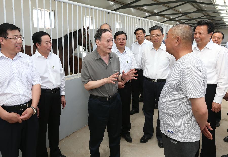 Wang Qishan (3rd L), a member of the Standing Committee of the Political Bureau of the Communist Party of China (CPC) Central Committee and secretary of the Central Commission for Discipline Inspection (CCDI) of the CPC, visits a horse breeding base in Xilinhot City, north China's Inner Mongolia Autonomous Region, July 3, 2014. Wang made an inspection tour in Xilingol League from July 3 to 4. (Xinhua/Pang Xinglei)