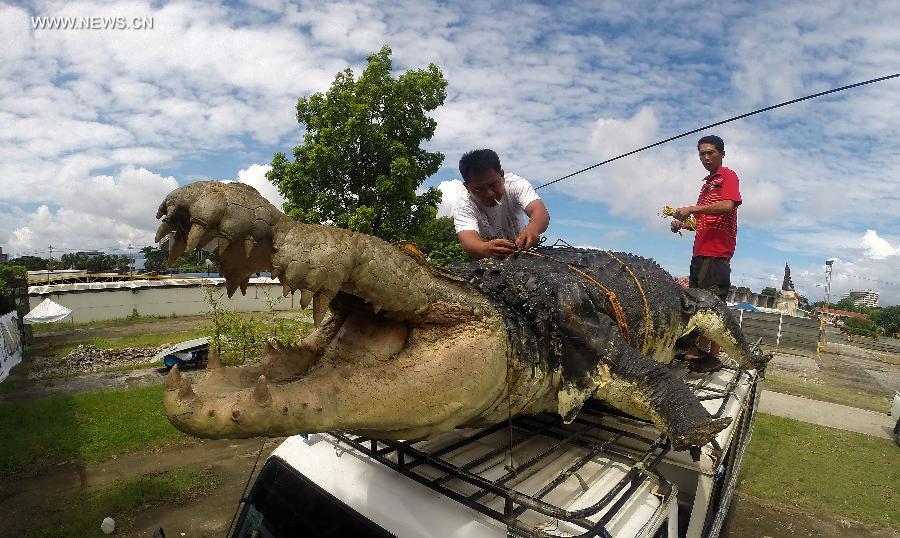 Workers prepare to unload "Longlong", a 21-foot robot crocodile from a truck at the Crocodile Park in Pasay City, the Philippines, July 5, 2014. The robot crocodile, costing around 80,000 pesos, or 1,818 U.S. dollars, is inspired by a giant saltwater crocodile, the longest crocodile on the earth, which died while in captivity in southern Philippines in 2013. (Xinhua/Rouelle Umali)