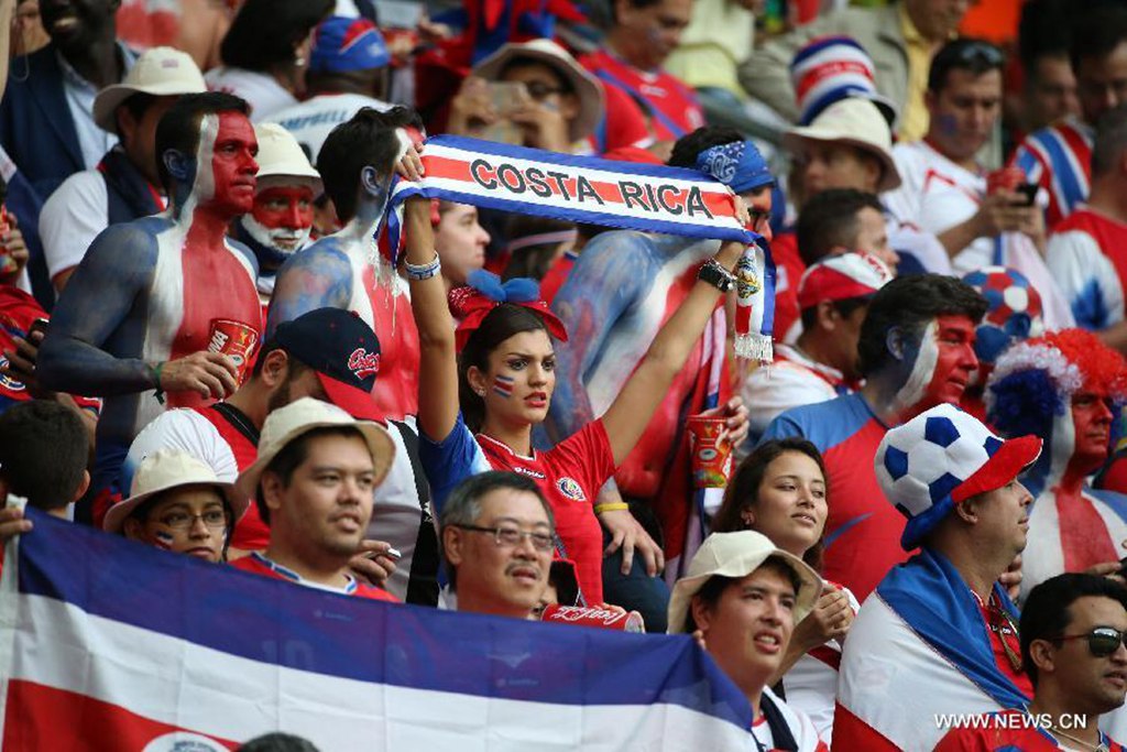 A Costa Rica's fan holds a banner before a quarter-finals match between Netherlands and Costa Rica of 2014 FIFA World Cup at the Arena Fonte Nova Stadium in Salvador, Brazil, on July 5, 2014.(Xinhua/Cao Can)