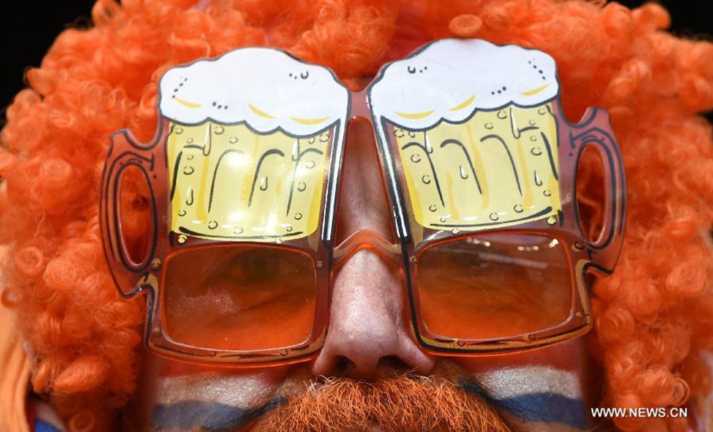 A Netherlands's fan poses before a quarter-finals match between Netherlands and Costa Rica of 2014 FIFA World Cup at the Arena Fonte Nova Stadium in Salvador, Brazil, on July 5, 2014.(Xinhua/Lui Siu Wai)