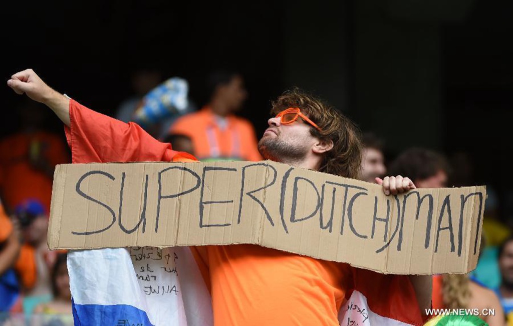 A Netherlands' fan poses before a quarter-finals match between Netherlands and Costa Rica of 2014 FIFA World Cup at the Arena Fonte Nova Stadium in Salvador, Brazil, on July 5, 2014.(Xinhua/Guo Yong)
