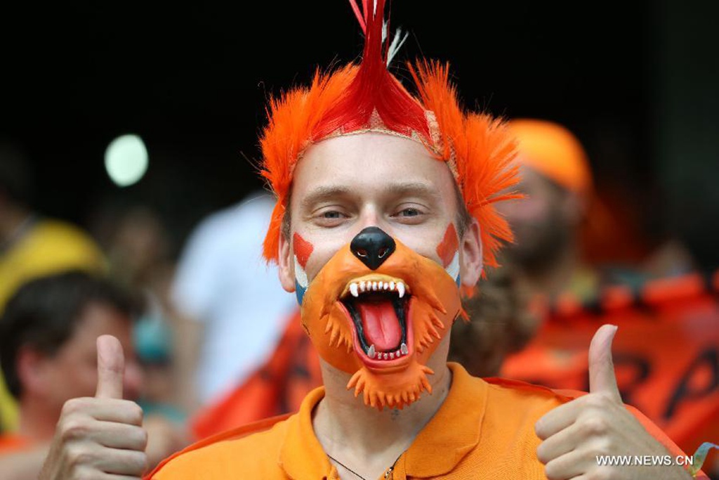 A Netherlands' fan poses before a quarter-finals match between Netherlands and Costa Rica of 2014 FIFA World Cup at the Arena Fonte Nova Stadium in Salvador, Brazil, on July 5, 2014.(Xinhua/Cao Can)