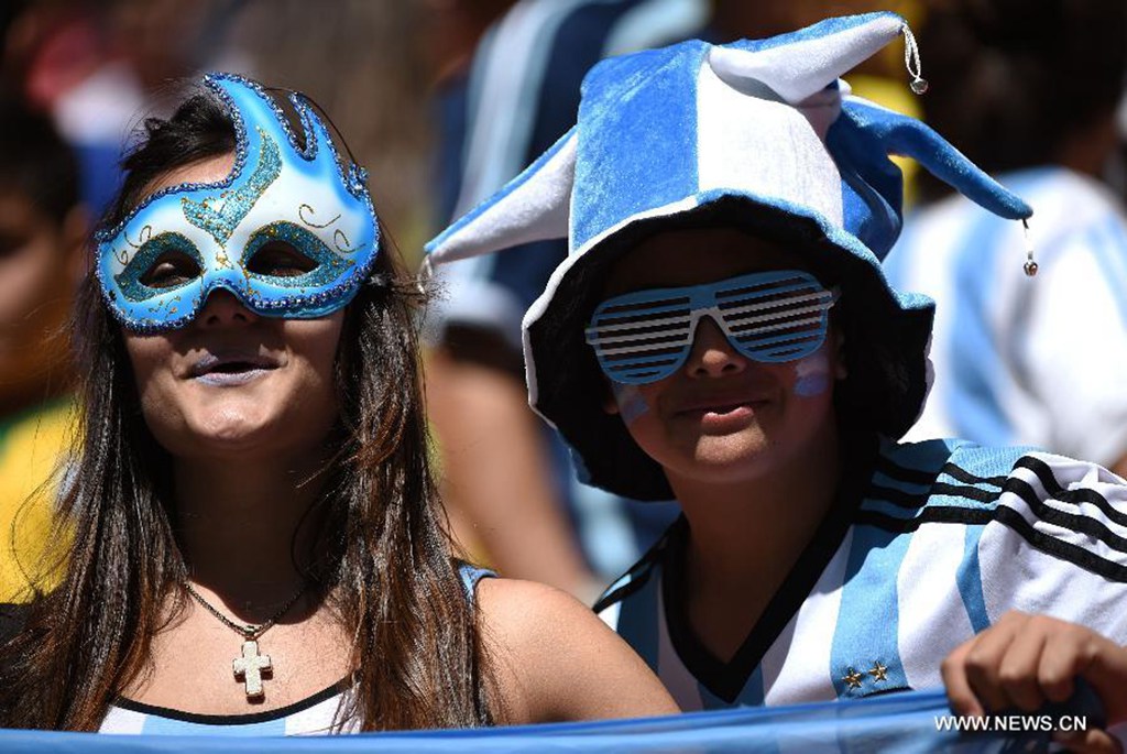 Argentina's fans pose before a quarter-finals match between Argentina and Belgium of 2014 FIFA World Cup at the Estadio Nacional Stadium in Brasilia, Brazil, on July 5, 2014.(Xinhua/Liu Dawei)