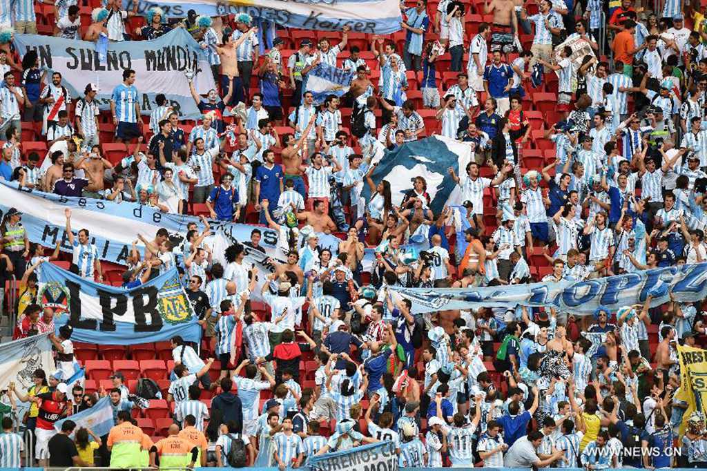 Argentina's fans celebrate the victory after a quarter-finals match between Argentina and Belgium of 2014 FIFA World Cup at the Estadio Nacional Stadium in Brasilia, Brazil, on July 5, 2014. Argentina won 1-0 over Belgium and qualified for the semi-finals. (Xinhua/Liu Dawei)