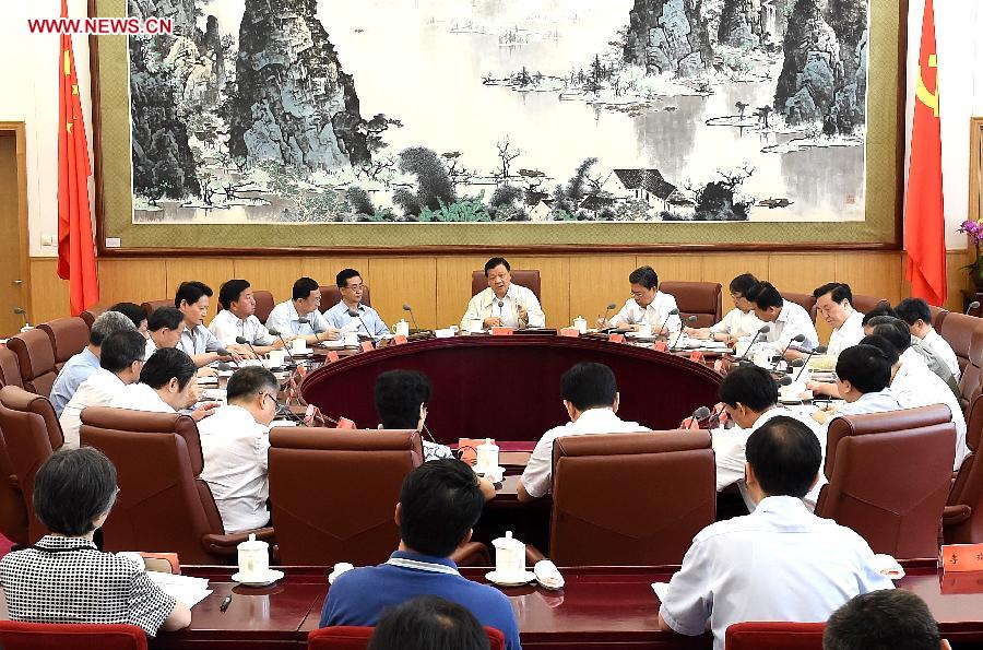 Liu Yunshan (C rear), a Standing Committee member of the Political Bureau of the Communist Party of China (CPC) Central Committee, presides over a meeting of the leading group of the Party's ongoing "mass-line" campaign in Beijing, China, July 5, 2014. (Xinhua/Liu Jiansheng)